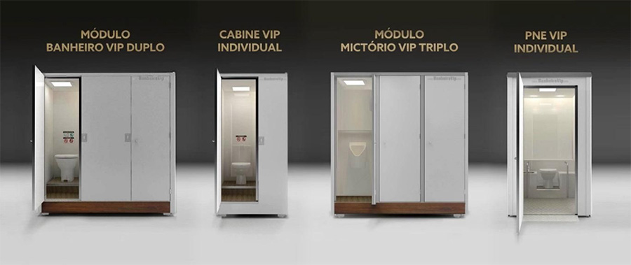 Veja abaixo mais imagens e detalhes de cada um de nossos 4 modelos de banheiros de luxo portáteis para eventos VIP: